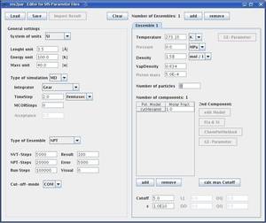 The feature tool ms2par is GUI-based and allows for a convenient generation of *.par files according to user specifications, cf. Figure. It defines the molecular model, ensemble, thermodynamic state point, time step, number of equilibration steps, etc. Furthermore, the tool proposes a cut-off radius, based on the input data. After the user completes the specifications, the program generates the ASCII file *.par, to be read by ms2.