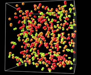 Snapshot (click to enlarge) of a ternary mixture taken with the visualization tool ms2molecules. The mixture consists of ethane colored red, methane colored orange, and carbon dioxide colored green. The white frame illustrates the size of the simulation box.